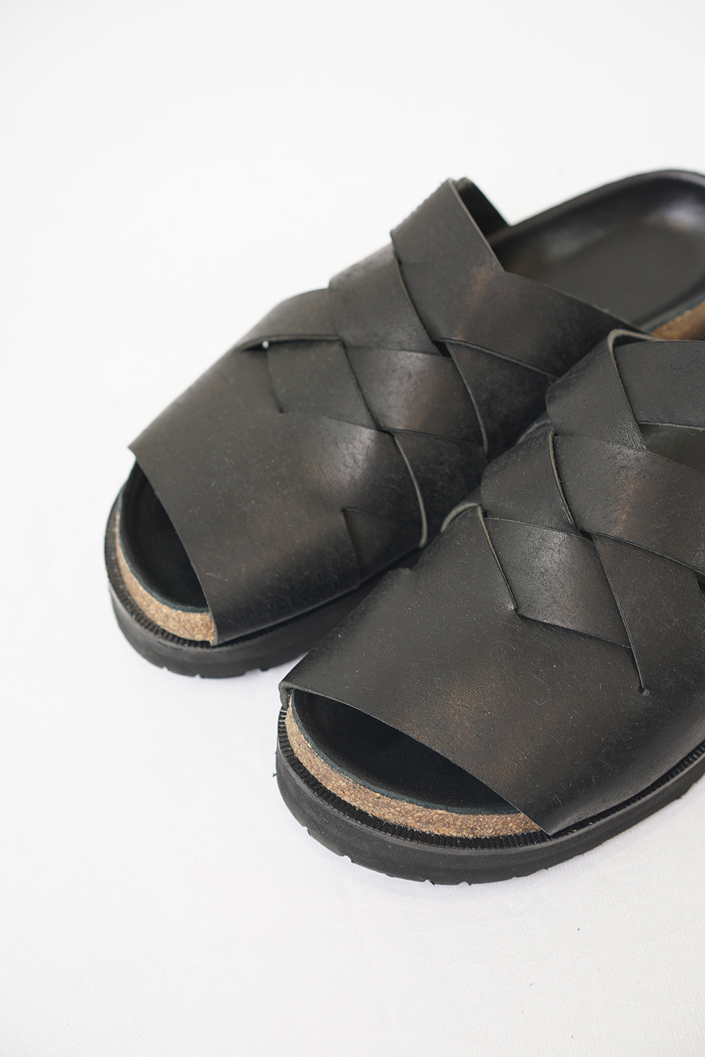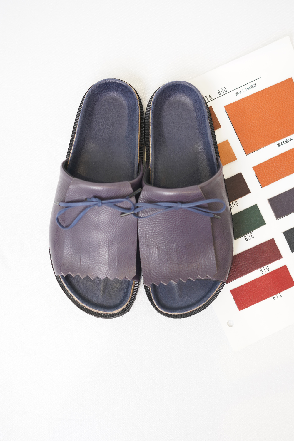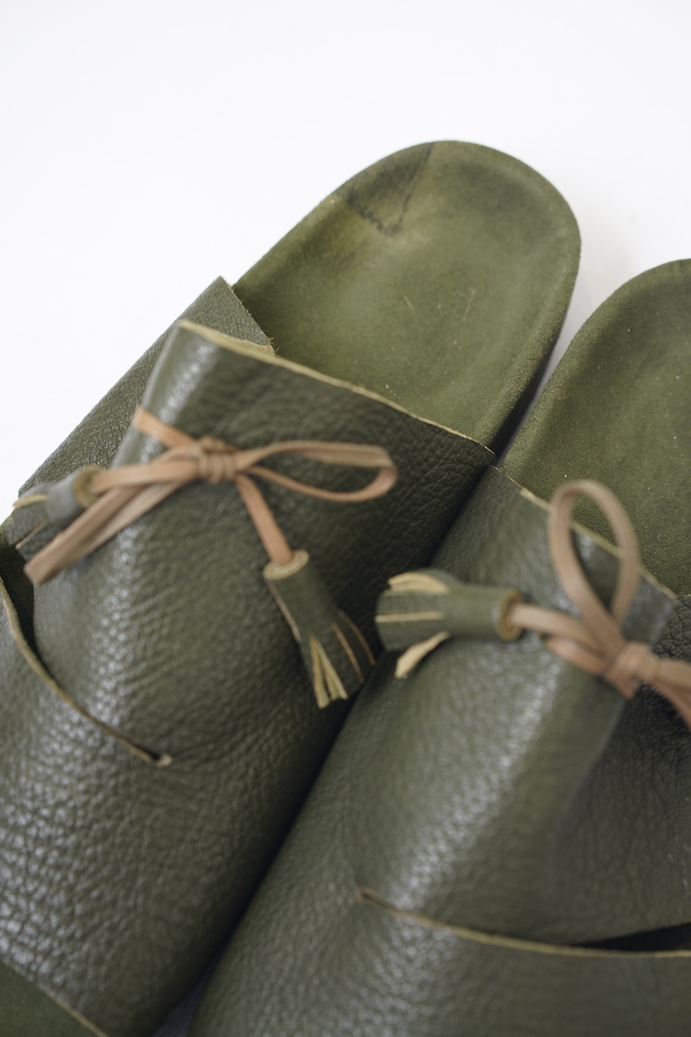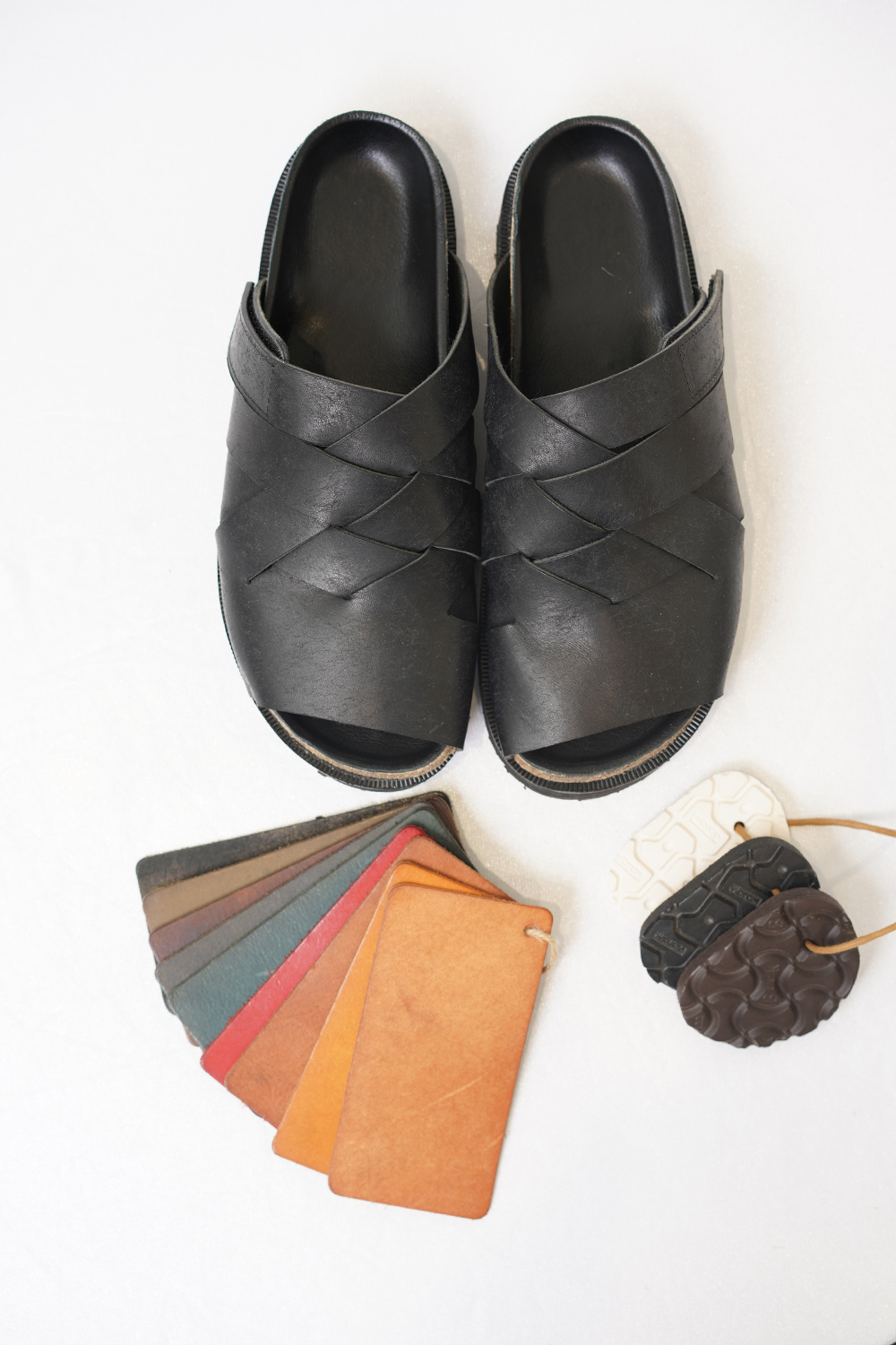 一枚革に切込みを入れたデザインで足をソフトに覆ってくれるサンダルです