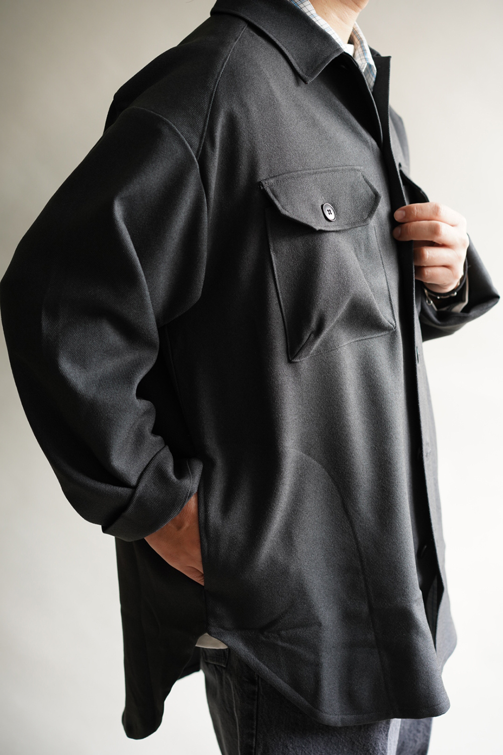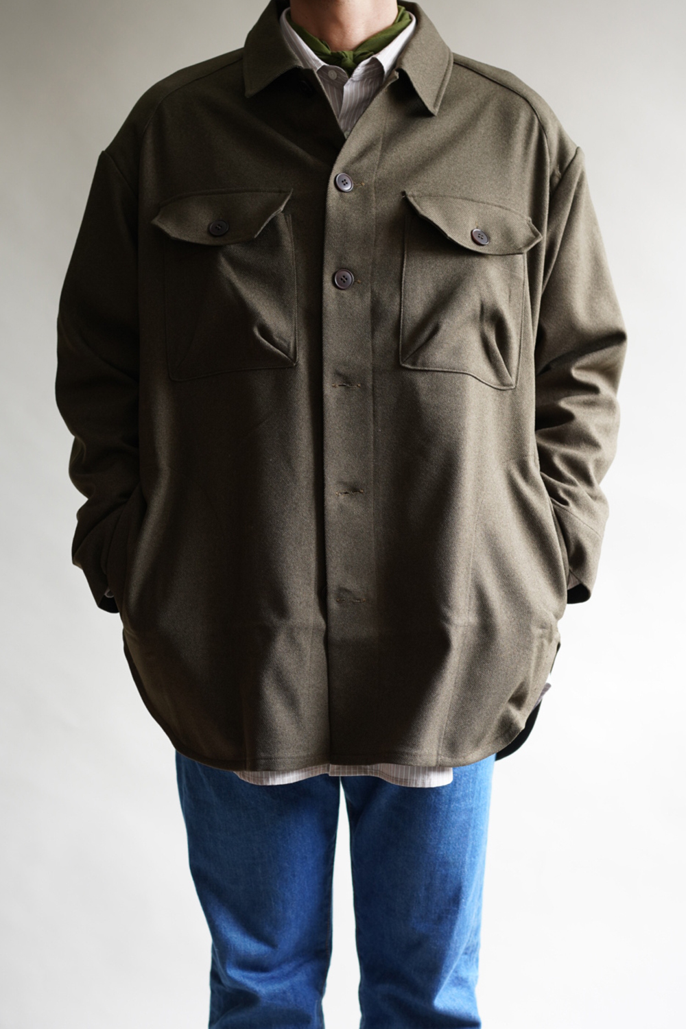 Aラインでドロップショルダーのゆったりとしたシルエット、中に厚手のKNIT・スウェット・インナーダウン が着用できるサイズ感です
