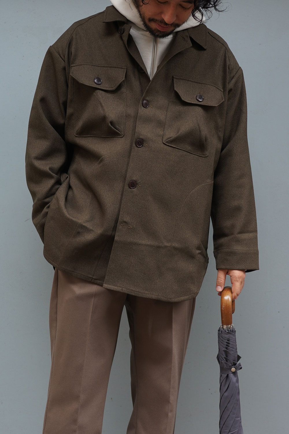 ウールのような質感と程よい光沢感があり、上品さも兼ね備えた印象のmilitaryITEM