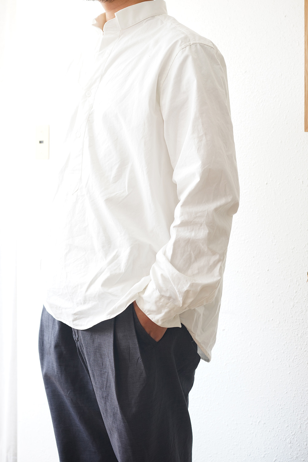 少し立ち上がった衿が特徴的、襟自体が縫い付けられており、襟が遊ぶ(動く)事なく スタンドカラーなどとはまた違った見え方をする