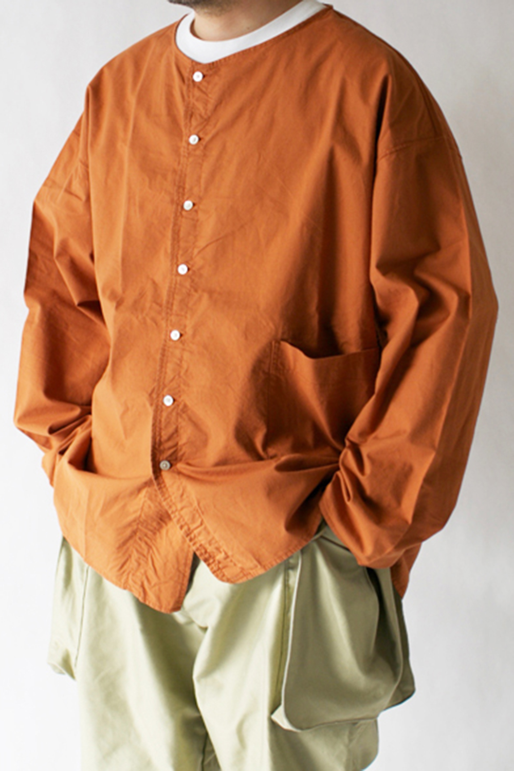 布帛をカット縫製工場で簡素に縫製したノーカラーシャツ。