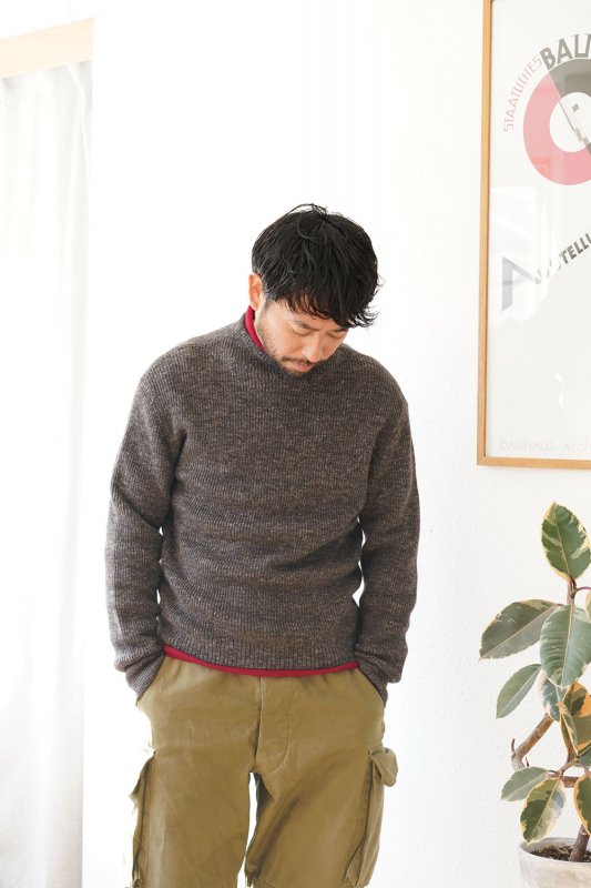油分のある英国羊毛をブレンドした太めの毛糸でざっくりと編んだローゲージニット。