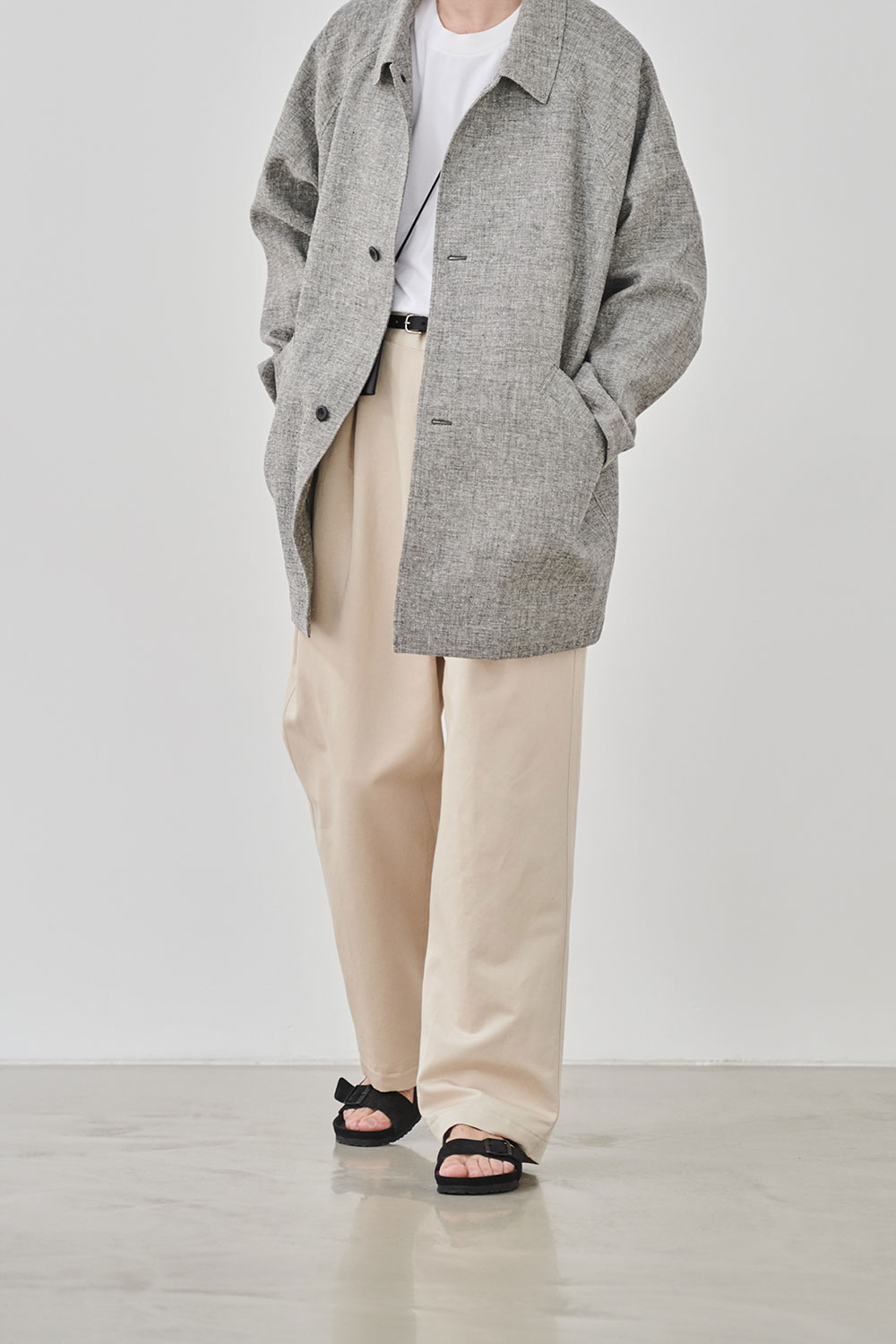 ウエスト周りの内側に折り込まれた「インボックスプリーツ」かっちりした印象を与えるデザインですが、生地感との相性でカジュアル感を演出する事で「程よいバランス」になっているので