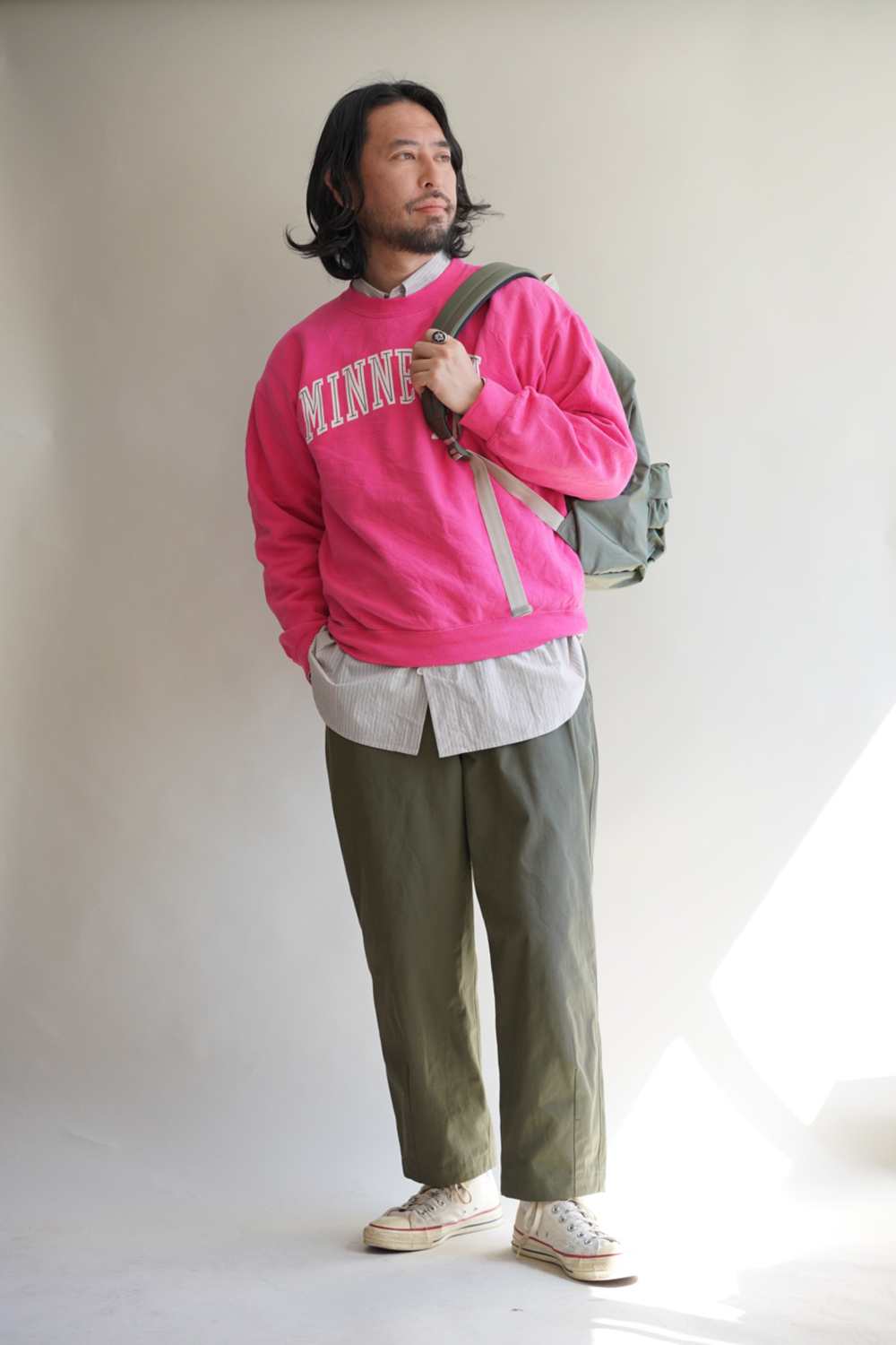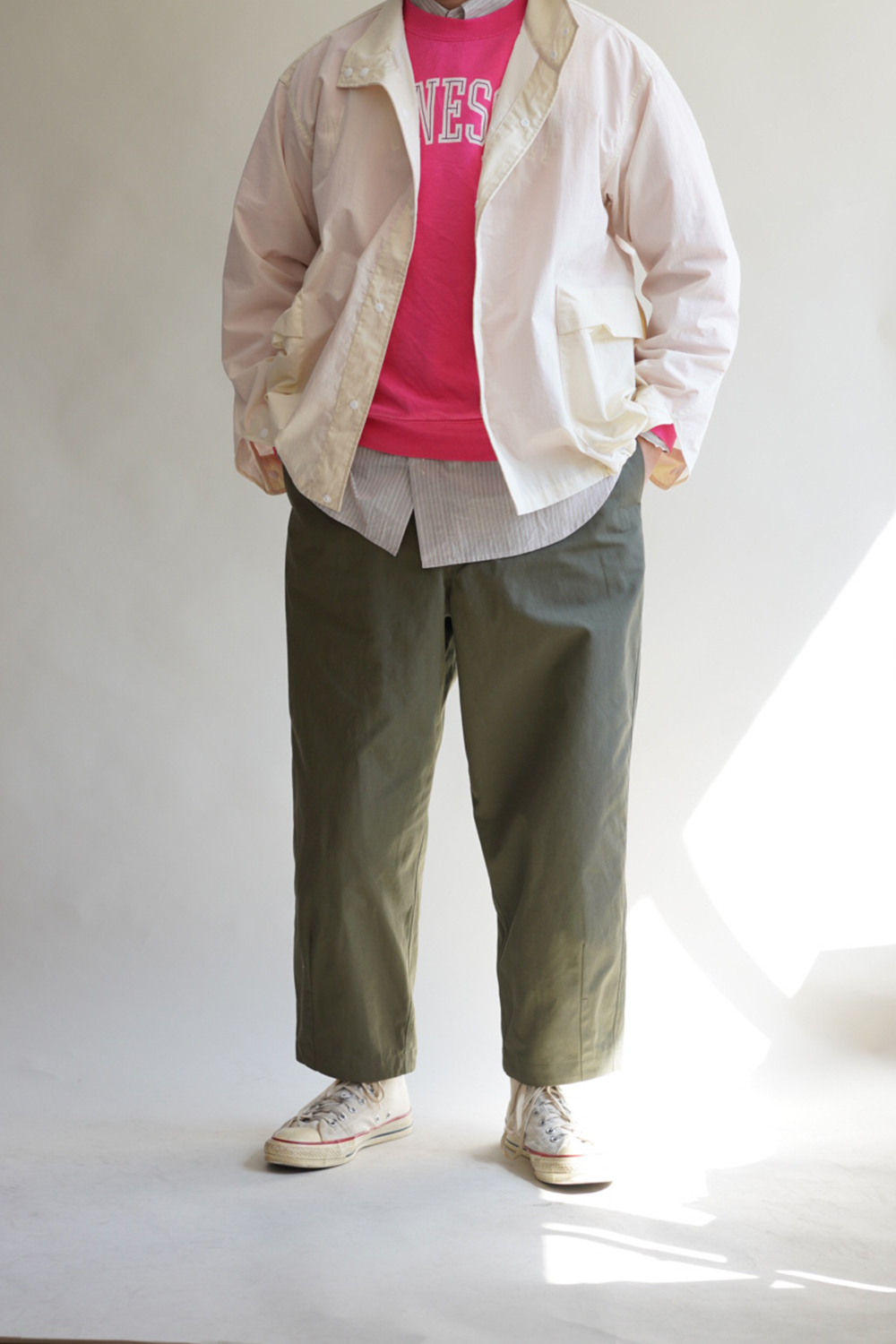チノパンのライバル的な存在になるとおもいますが、裾に向かって程よくテーパードかかったシルエットが、絶妙!!ほんのちょっとのデザインですが、凄くデザインが効いいて、体のラインを綺麗にみせてくれていると思いました。