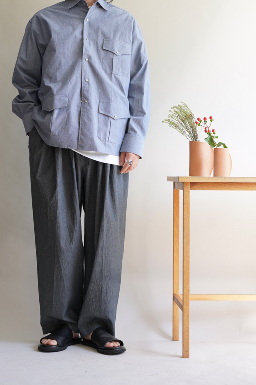 生地・付属使い・襟の形など、上品な印象がある珍しいワークシャツです