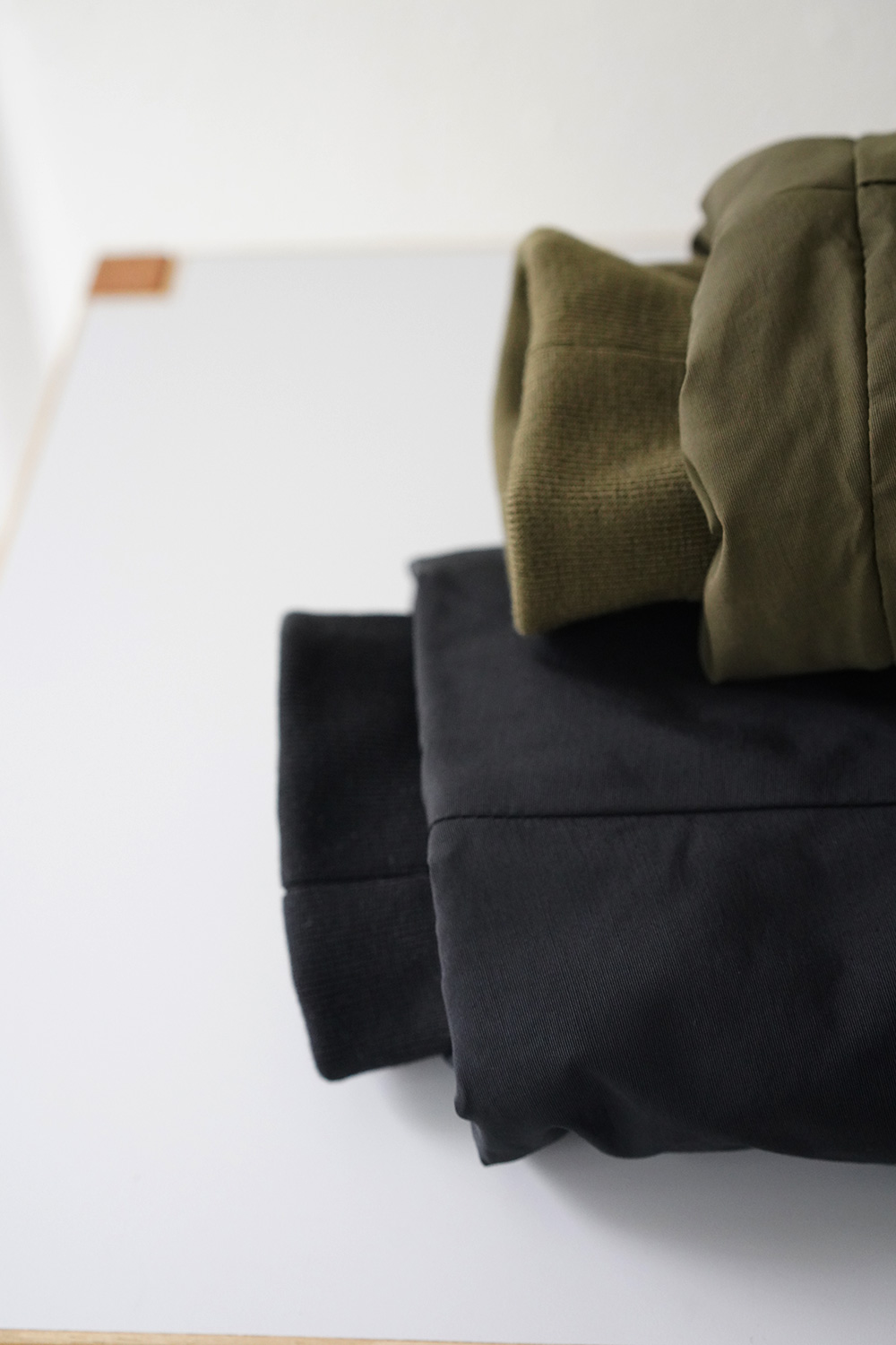 雨や雪といった悪天候時には、6割のコットンが膨張して生地の隙間を埋め、生地全体の密度が増します。残りの4割のナイロンは元々の性質上、水を弾き、風をシャットアウトしてくれ、撥水性と防風性を備えた、機能素材になります。