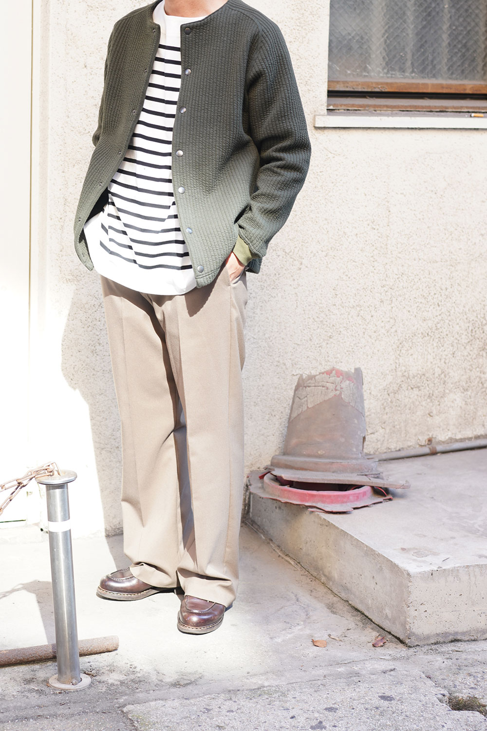 カーディガンに比べて、ノーカラーのライナージャケットとして、ジャケット感が更に強くなっております。