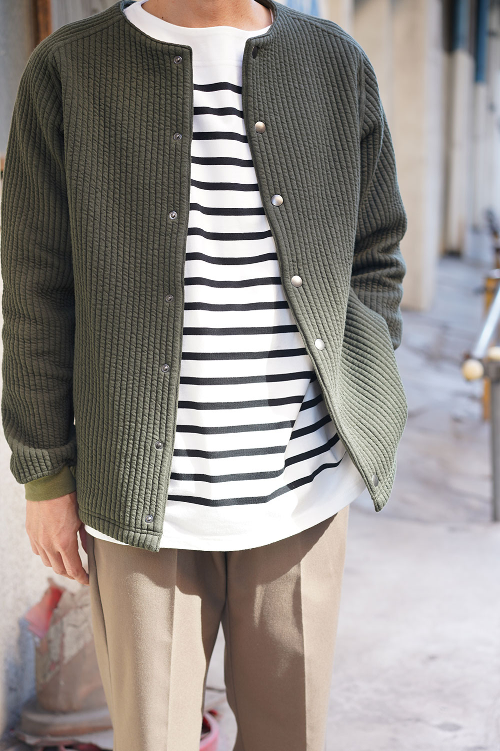 Audience トレッチストライプキルト ノーカラー スナップ ジャケットのWEB 詳細はこちら