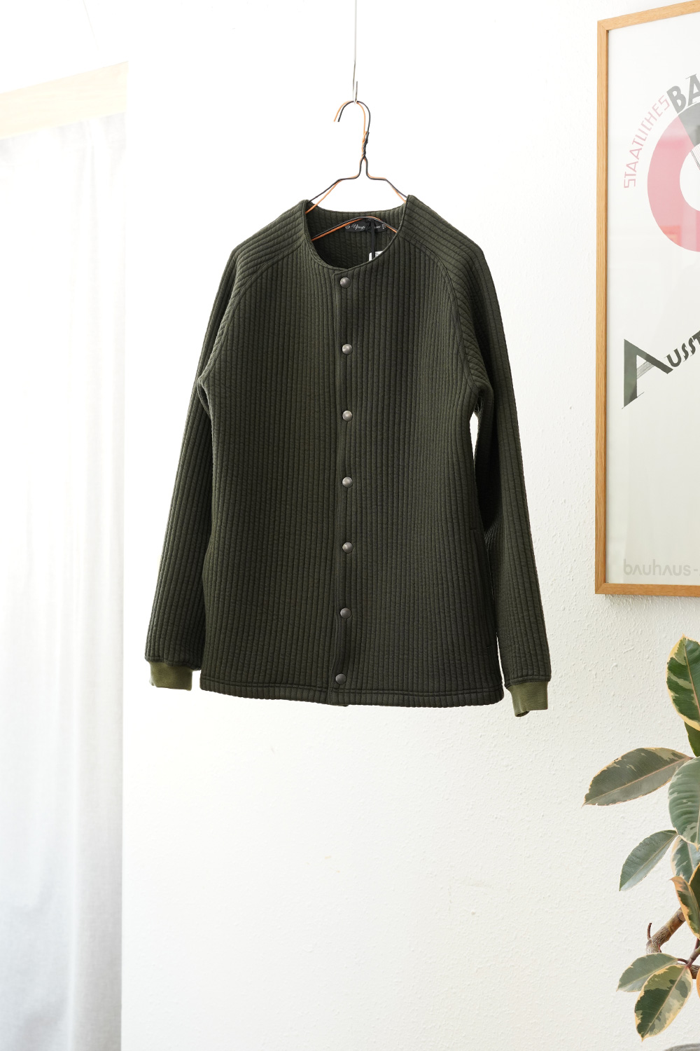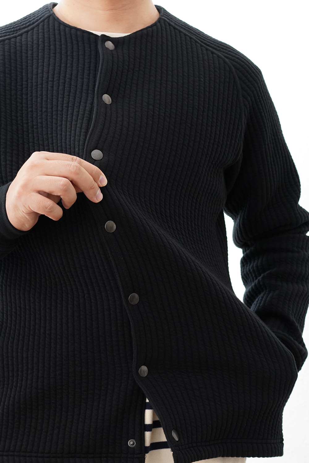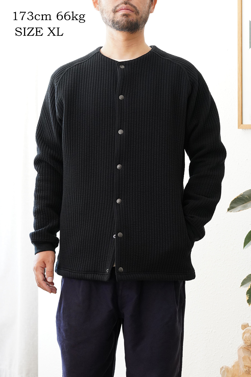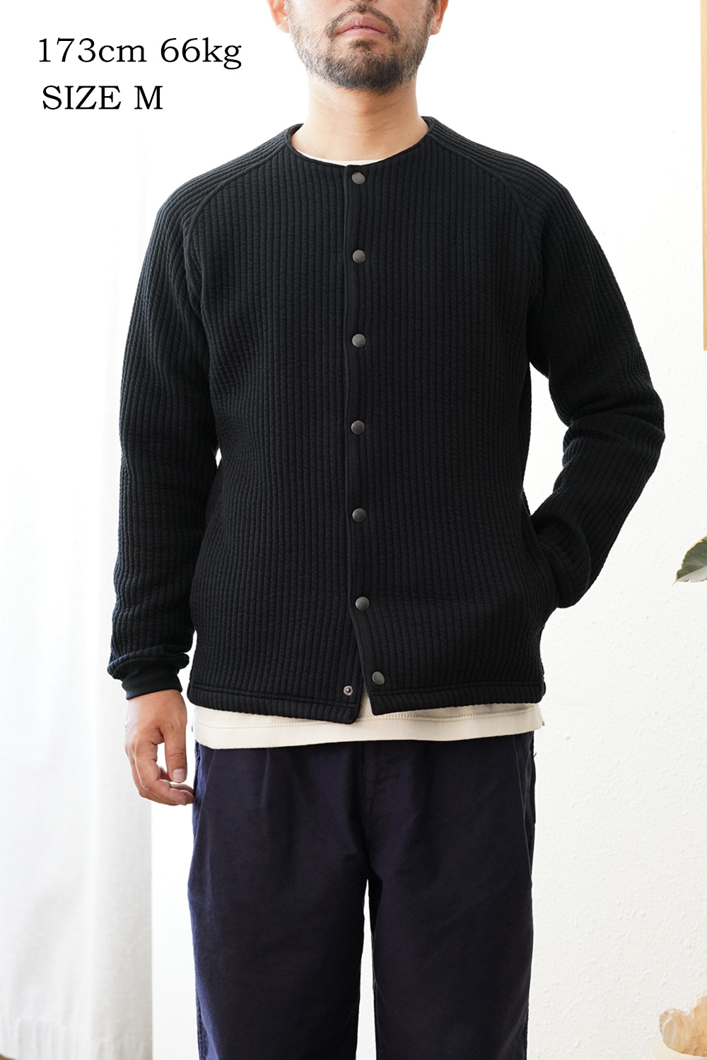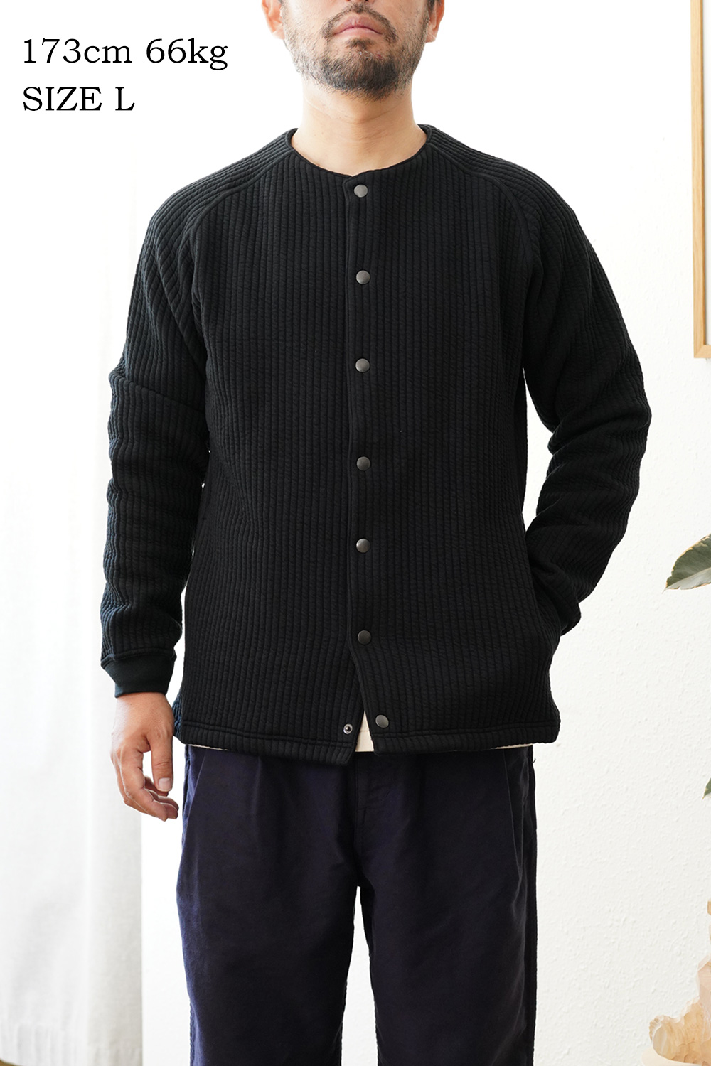 カーディガンに比べて、ノーカラーのライナージャケットとして、ジャケット感が更に強くなっております。