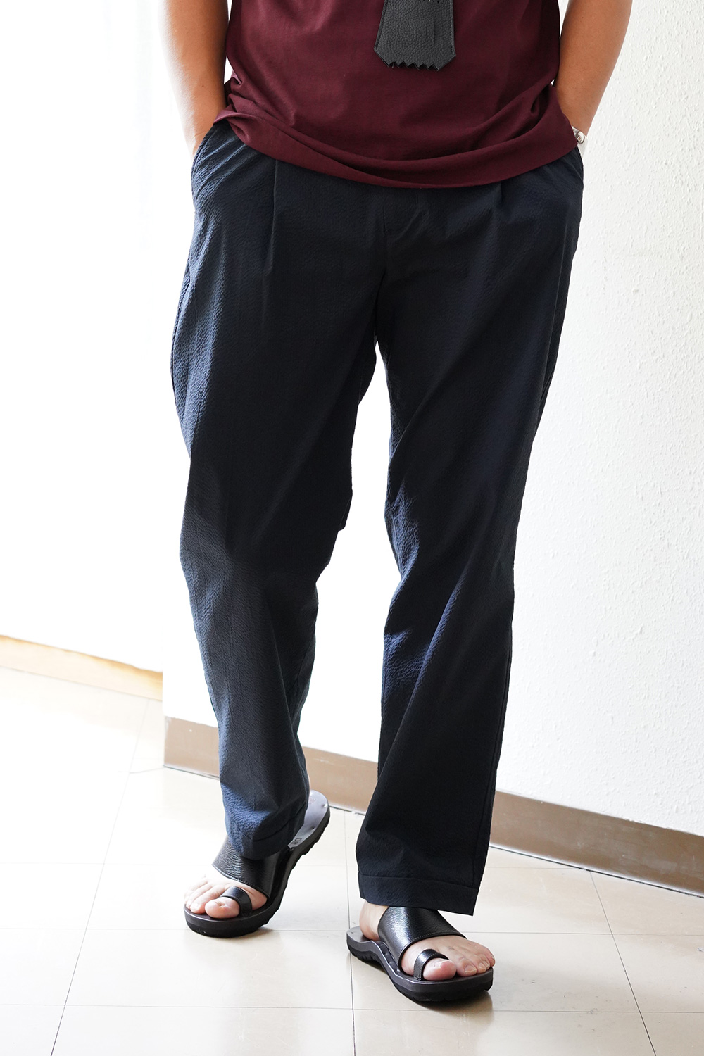 ポコポコ浮き上がった生地感は、通気性のよい生地、肌に纏わりつかない「肌離れ」がよい織り方で夏場の不快感を感じません