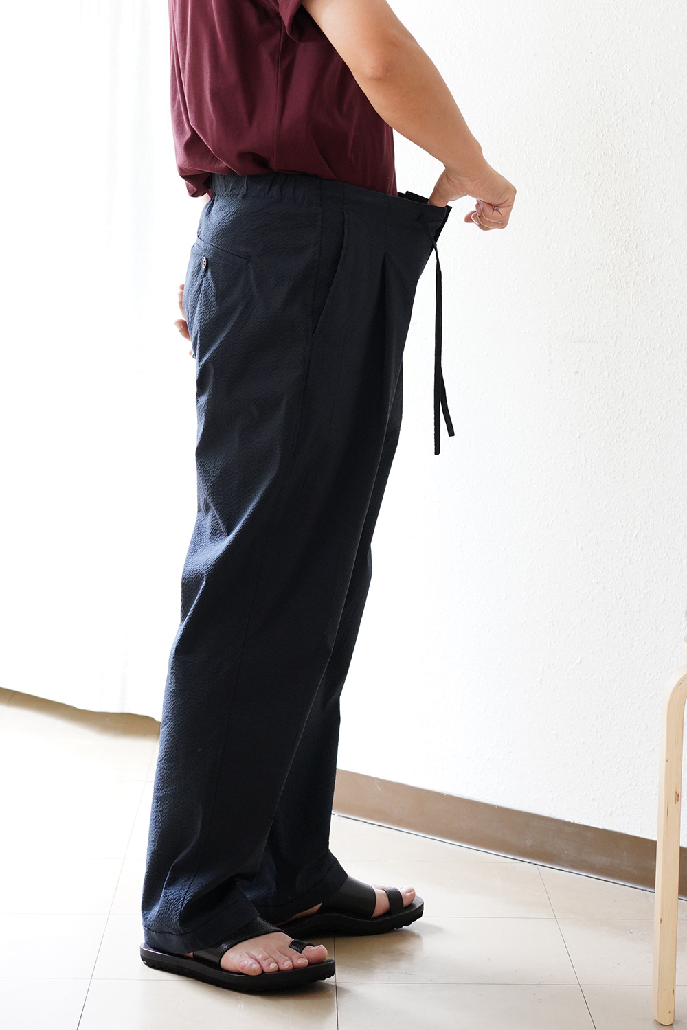 また紐でウエストを調節するイージー仕様 生地も程よく伸縮するストレッチ素材もまた「楽チン」です