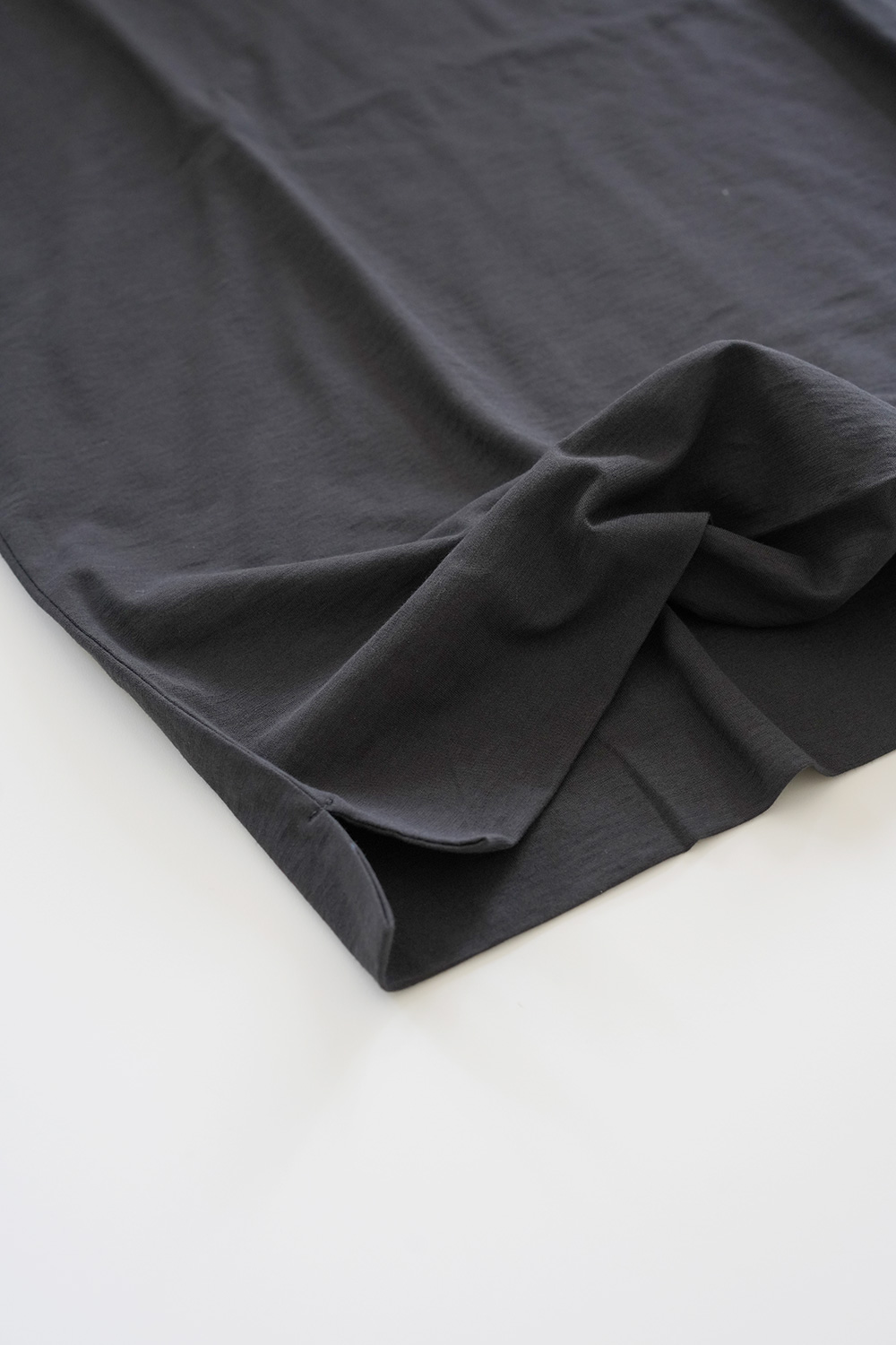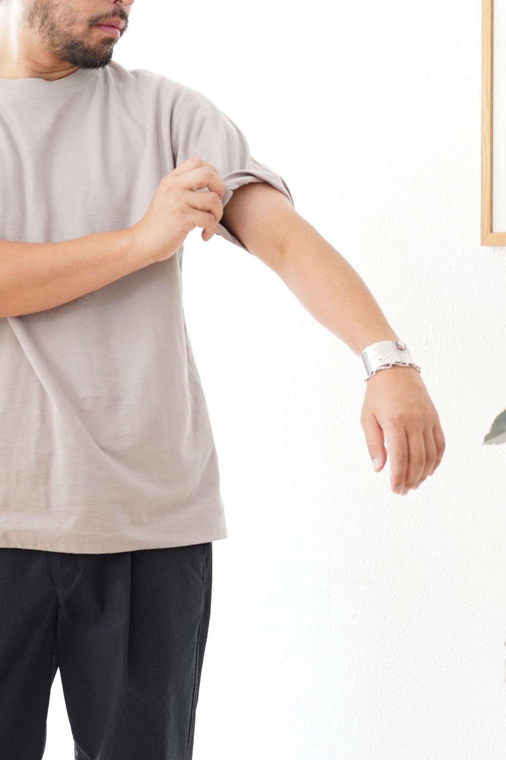 糸が細いので生地にすると1枚だと透けるため、2枚仕立てにし、縫製ステッチを全く表に出さない仕様のため、スッキリとした、キレイめのTeeシャツに仕上がっています。