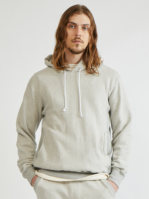1型目は、HEAVY PULLOVER HOOD SWEAT (ピグメント加工バージョン と グレー杢バージョンがあります)