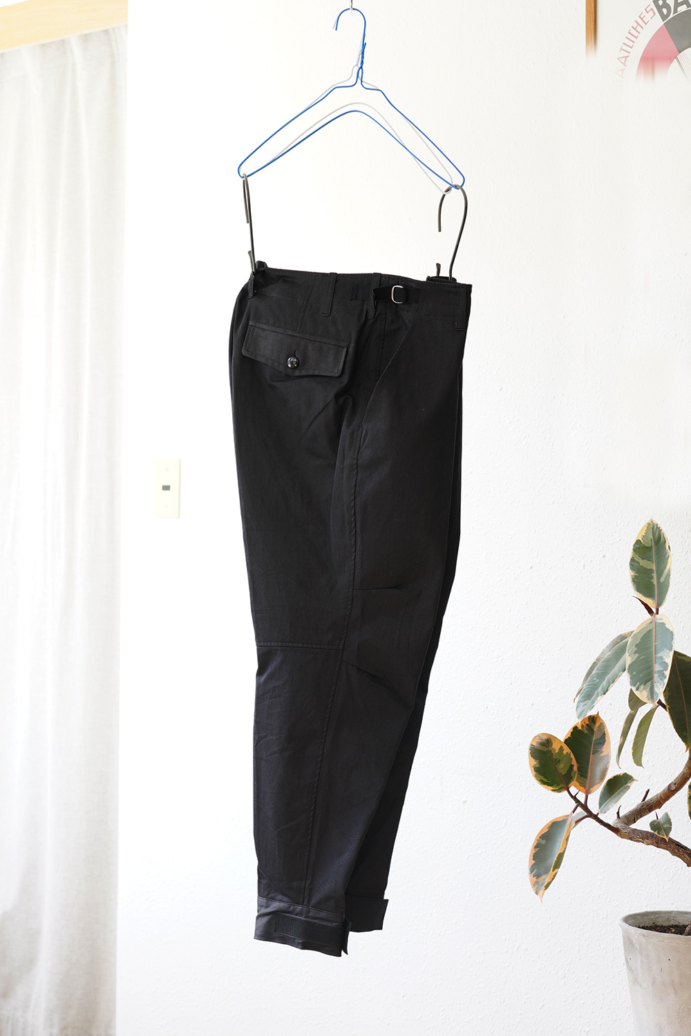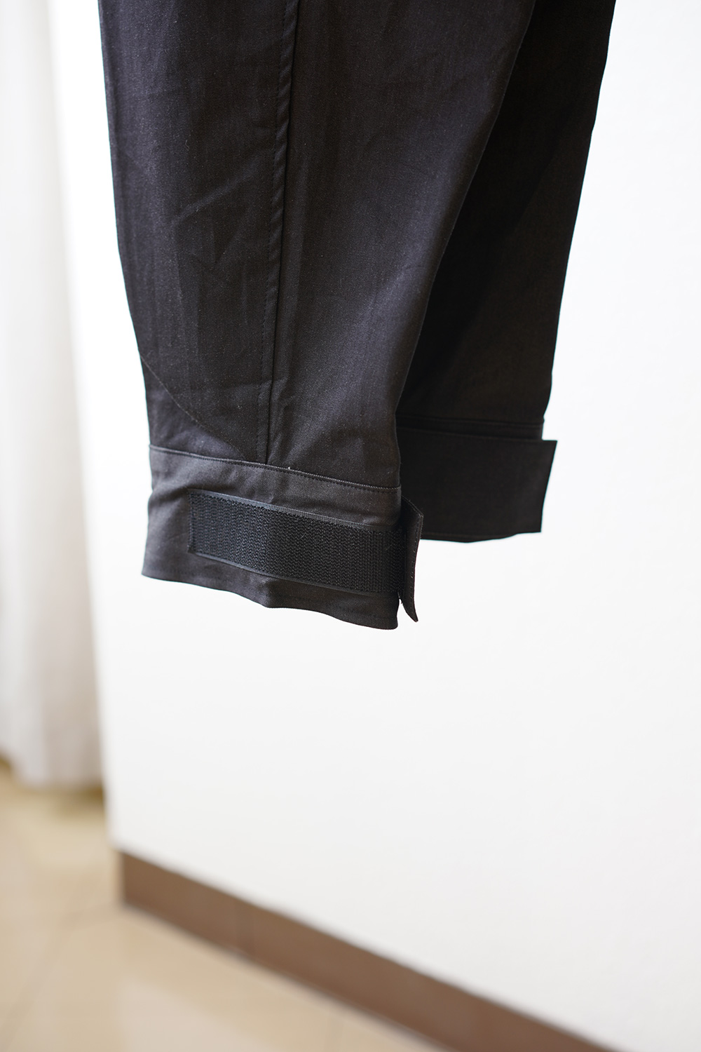 ヒップ周りにゆとりが有り、膝は立体裁断で前振り、裾はマジックテープでアジャスト可能なタイプになります。