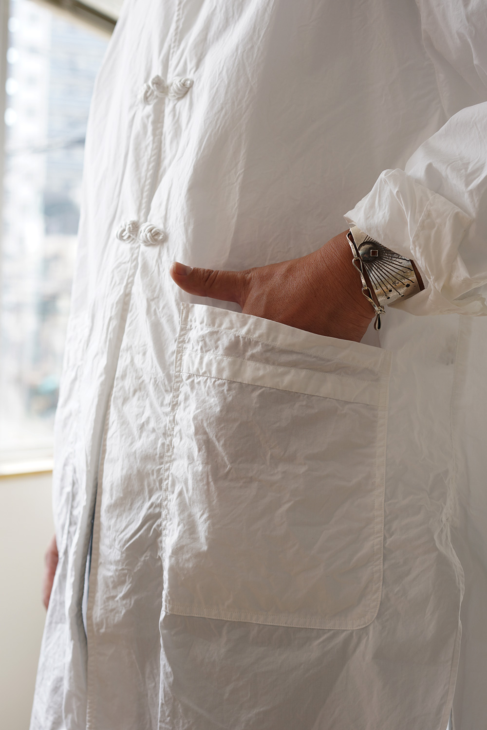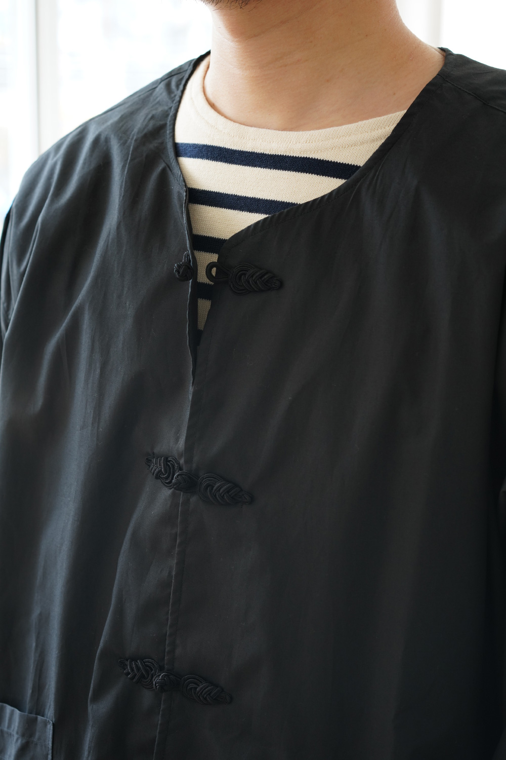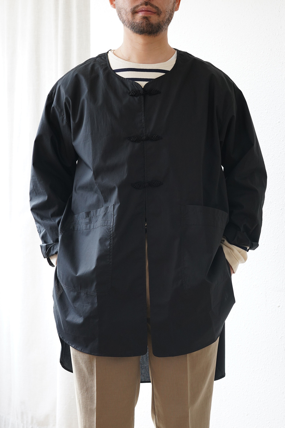 フロントにアクセントとしてチャイナトグルを使用した軽めのロング シャツになります。