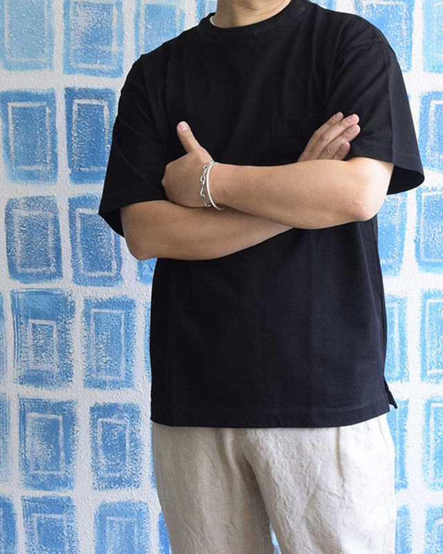 首元にはオリジナルデザインのリブを採用し、シンプルながらこだわりが詰まったアイテムです。