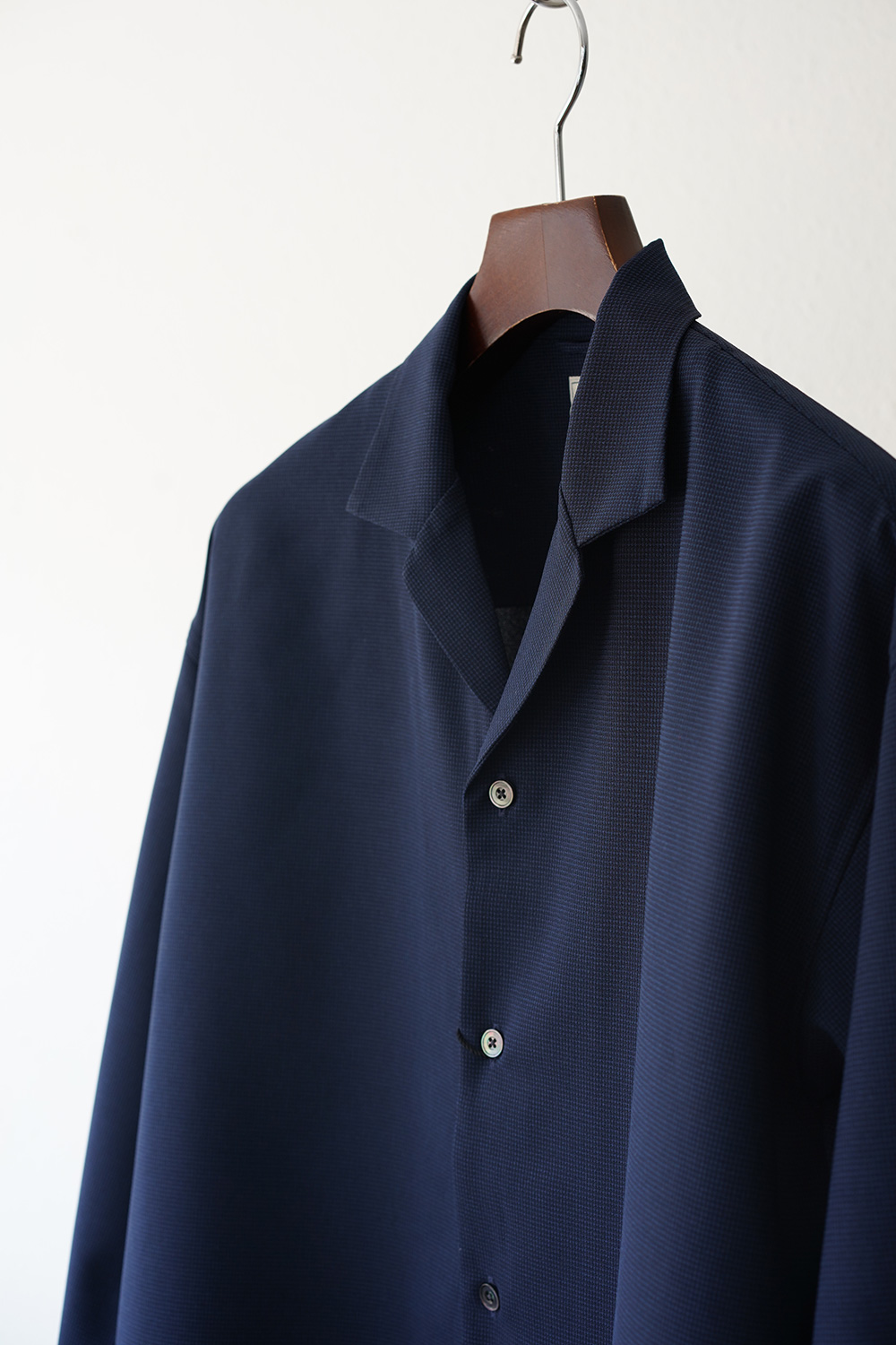 吸水速乾機能を持ち合わせた上質なポリエステル糸を使用し織られた国産生地は、美しい落ち感と適度なハリ、更には伸縮性をも兼ね備えています。