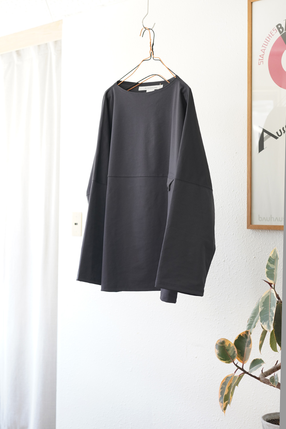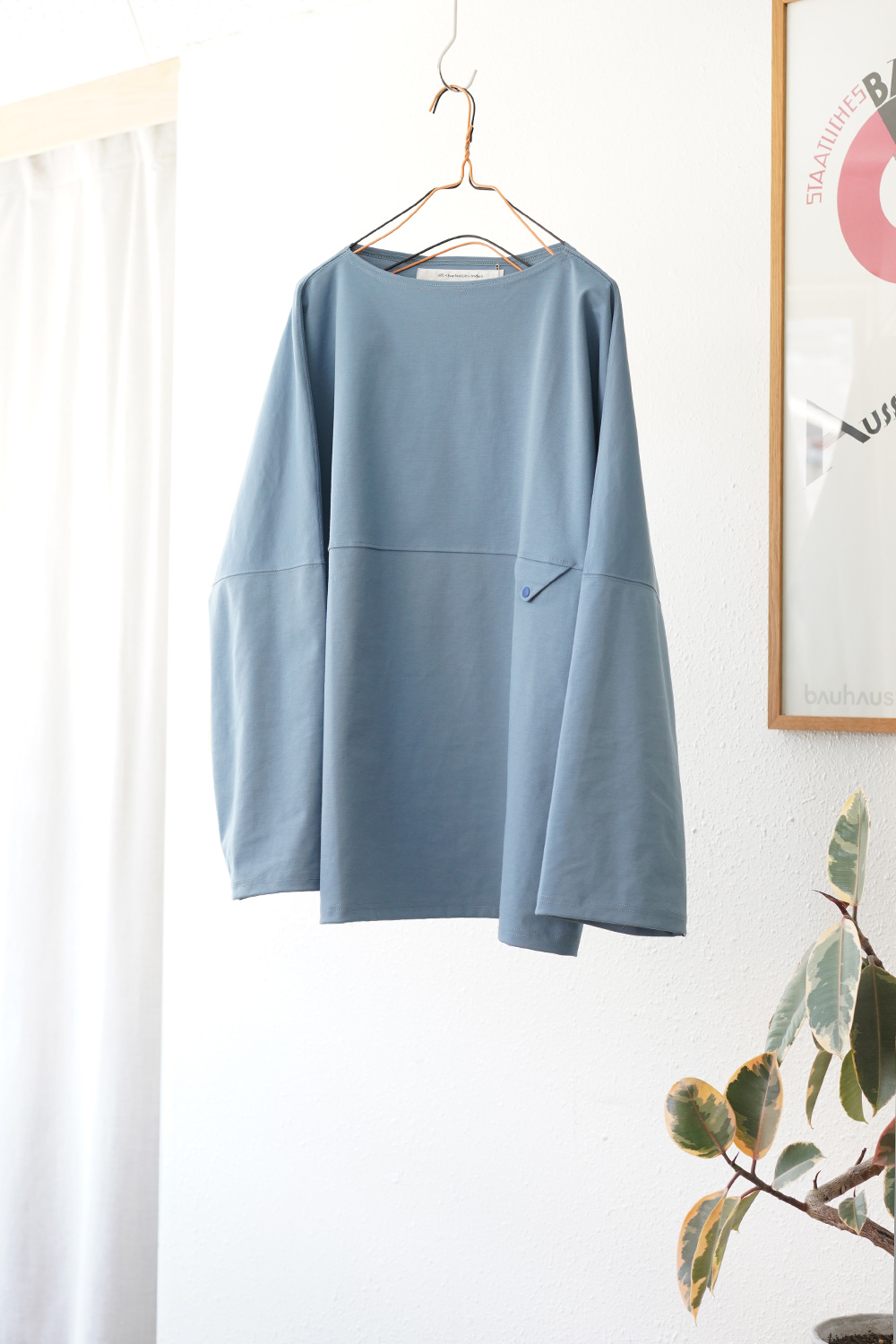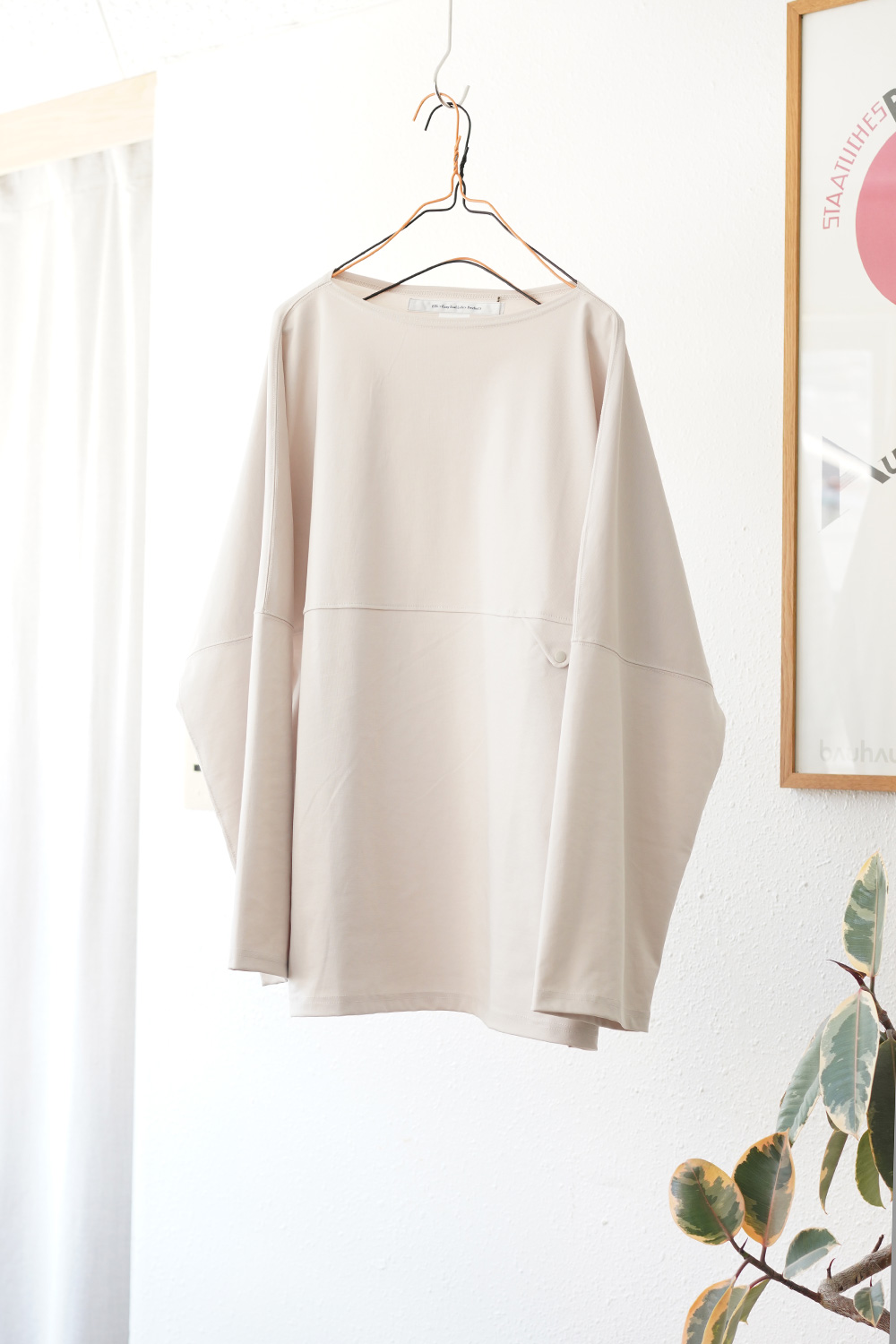 身幅にゆとりを持たせた、ボートネックデザイン、ざっくり着る事で涼し気な雰囲気に