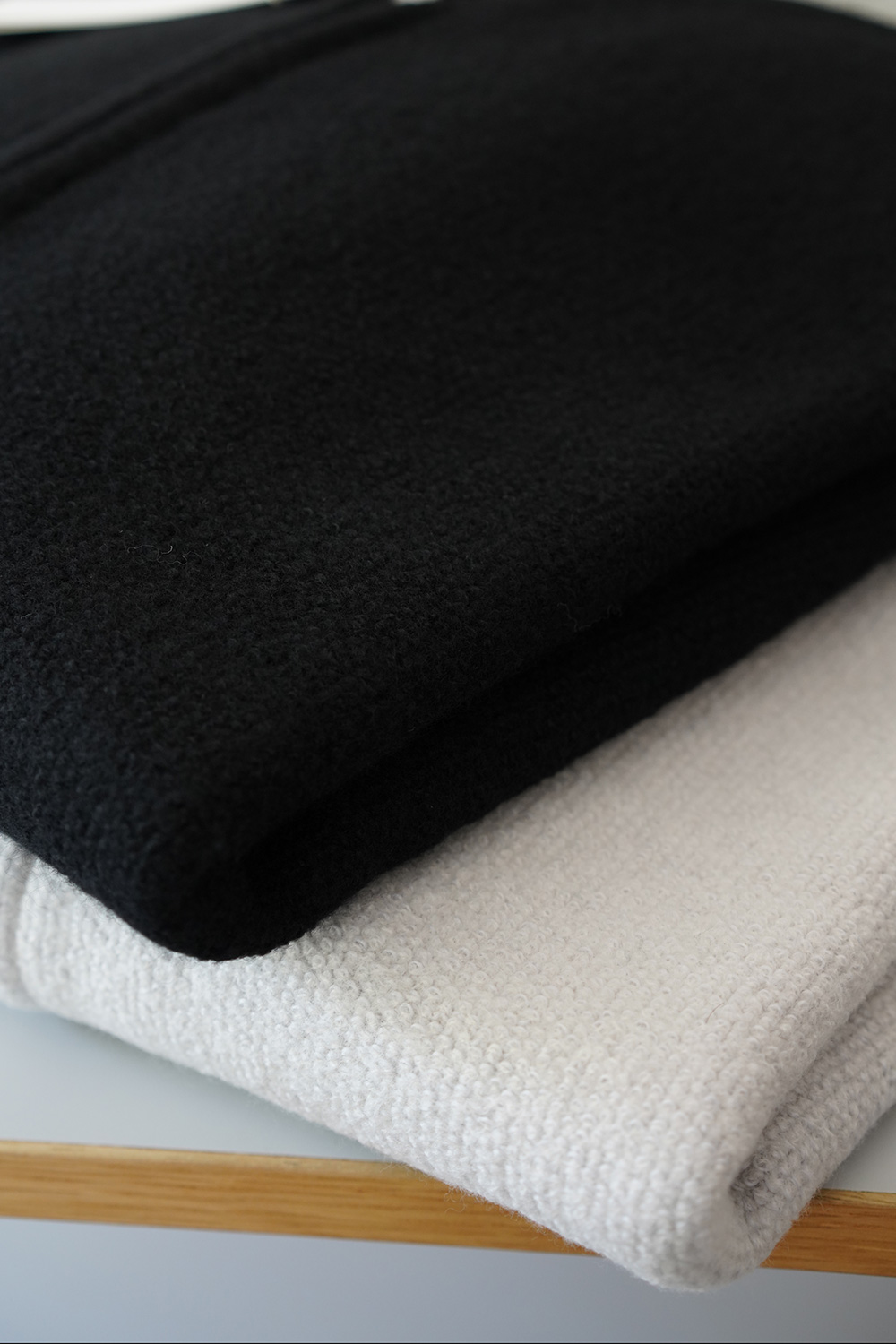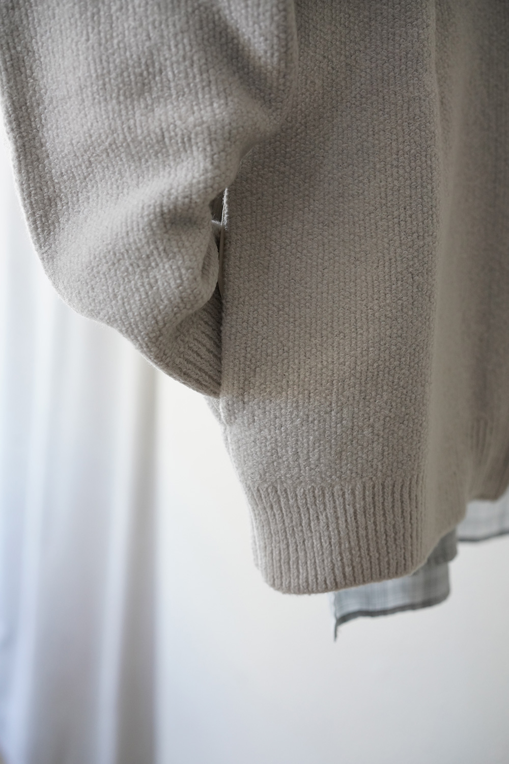 woolとカシミアを混紡した糸とポリエステル糸を組み合わせてKNIT