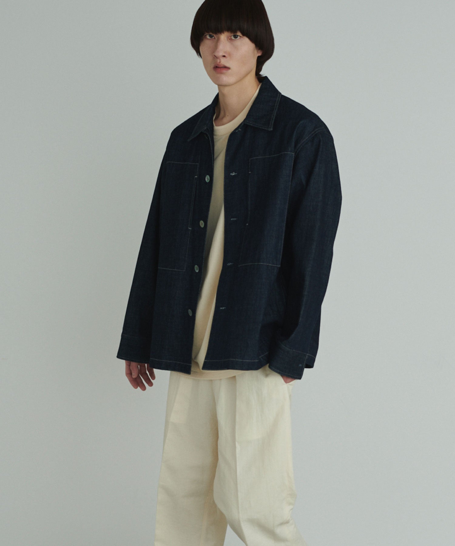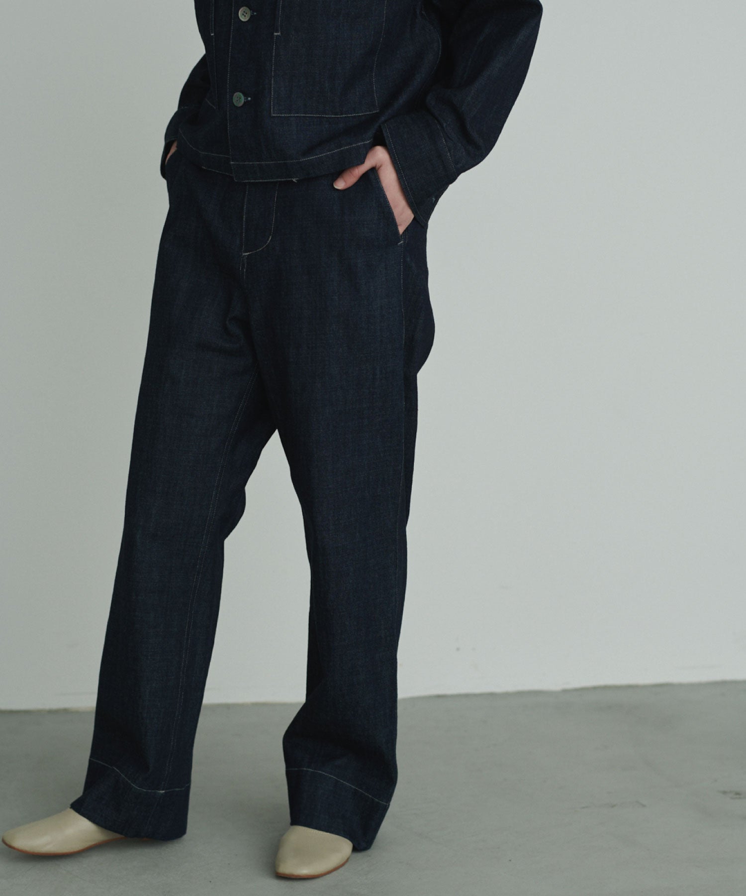 デニムらしいタフな表情は残しつつ、オーガニックコットンの柔らかさや程よいラフさと、独特の手触りや風合いも保ったやさしい履き心地も魅力のひとつ。華奢な黒蝶貝の釦や細かいステッチワーク、素材の軽さなどでモダンに表現しています。