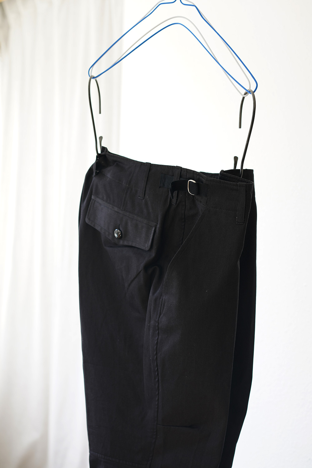 ヒップ周りにゆとりが有り、膝は立体裁断で前振り、裾はマジックテープでアジャスト可能なタイプになります。